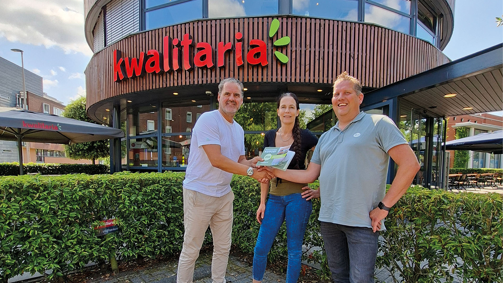 Met trots overhandigde algemeen directeur Joep Leemans het eerste exemplaar van het Duurzaamheidsrapport 2025 aan Linda Brouwer en Johan Sandee, Kwalitaria-ondernemers én leden van onze Duurzaamheidskopgroep. Zij denken actief mee en zetten zich in om andere ondernemers te inspireren en mee te nemen in de snackrevolutie.
